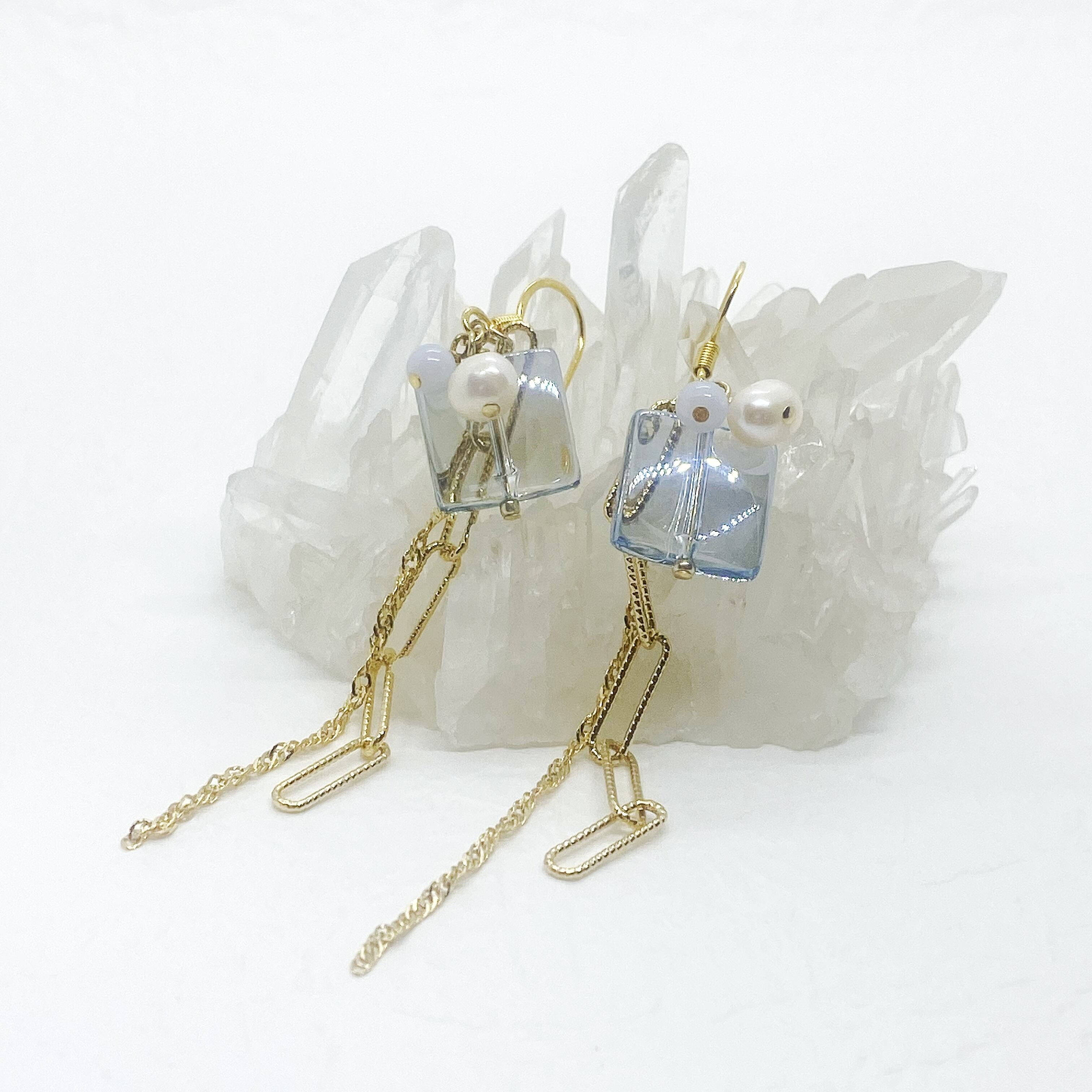 クリアブルーガラスにブルーレースアゲート、淡水パールを合わせたデザイン性高めのピアスです✧︎*。