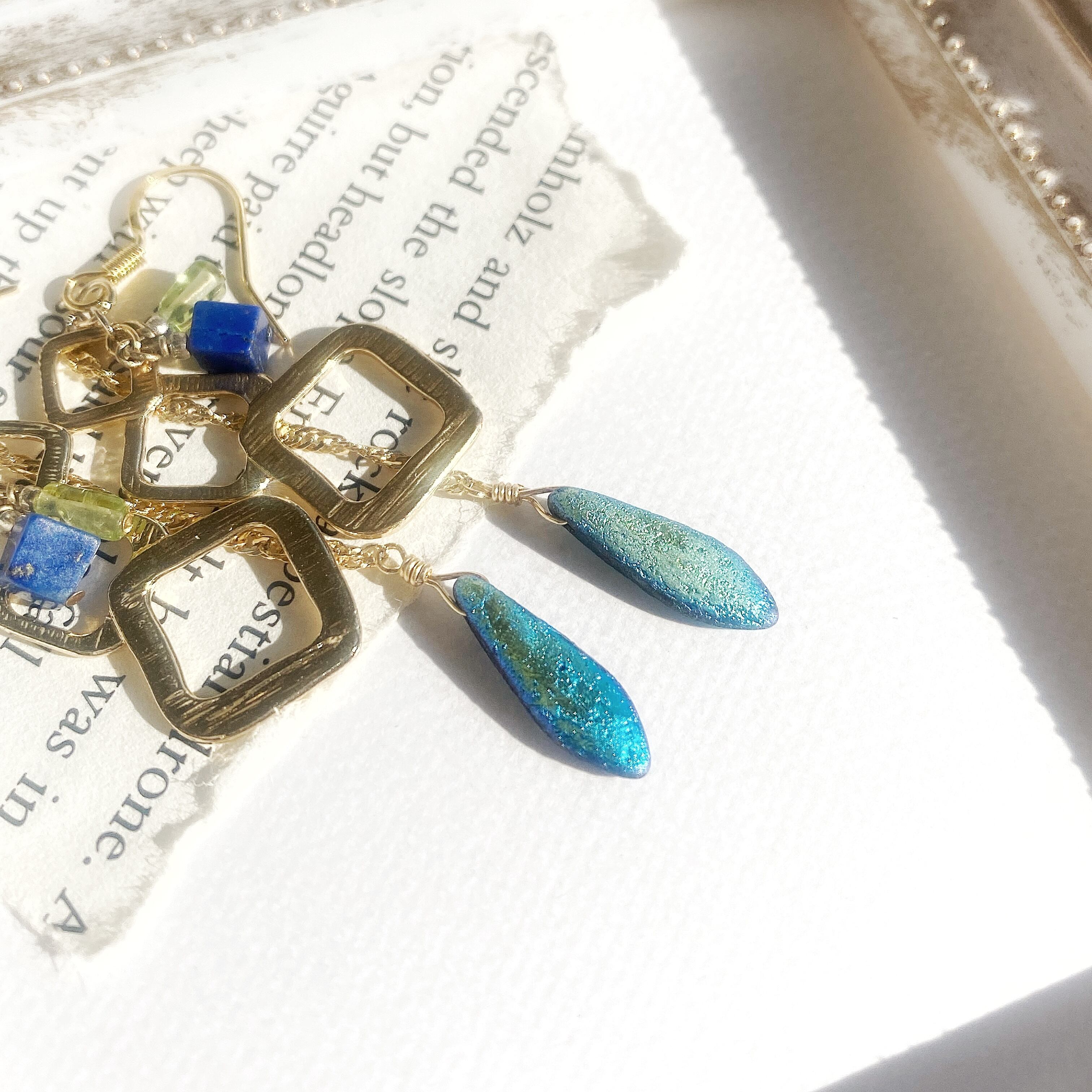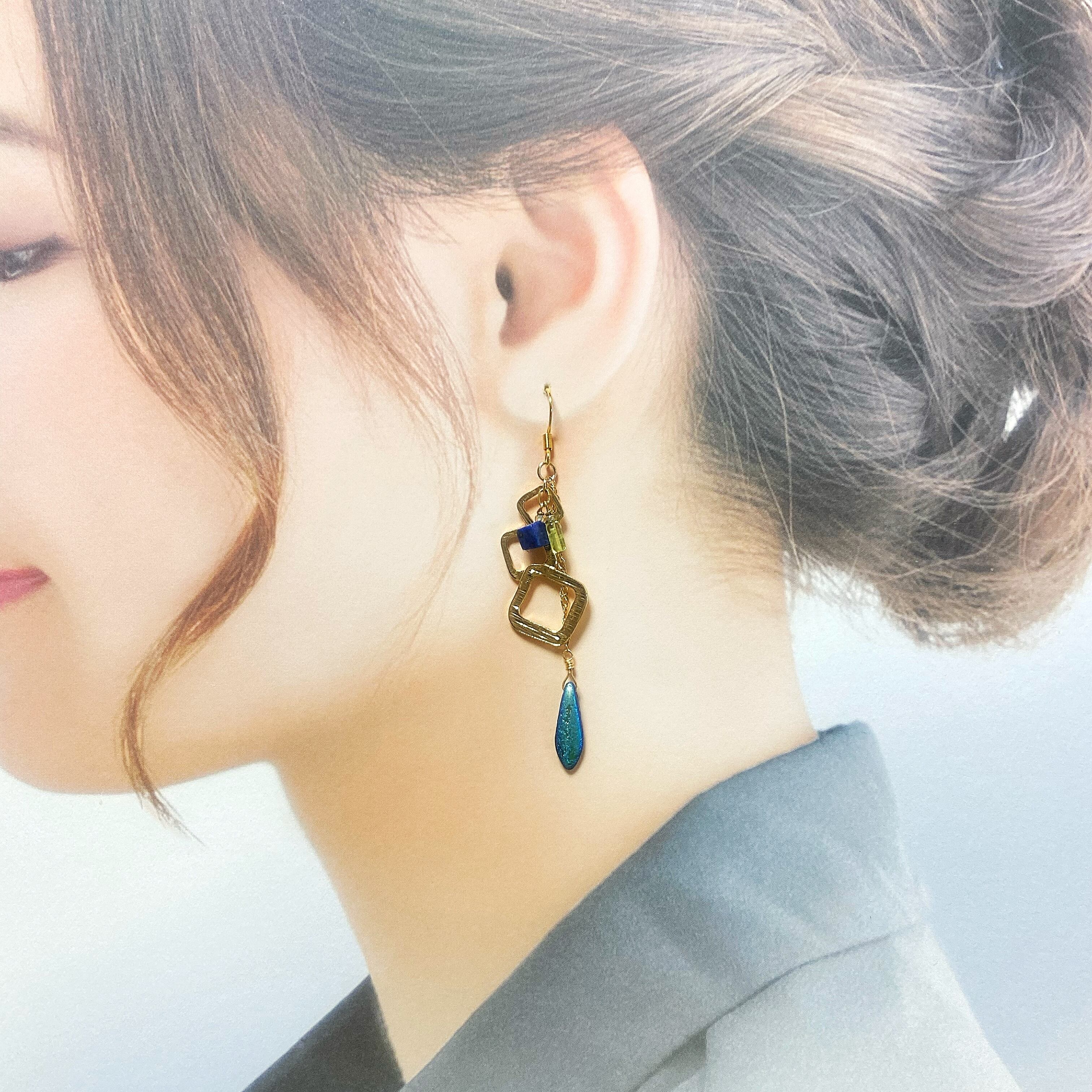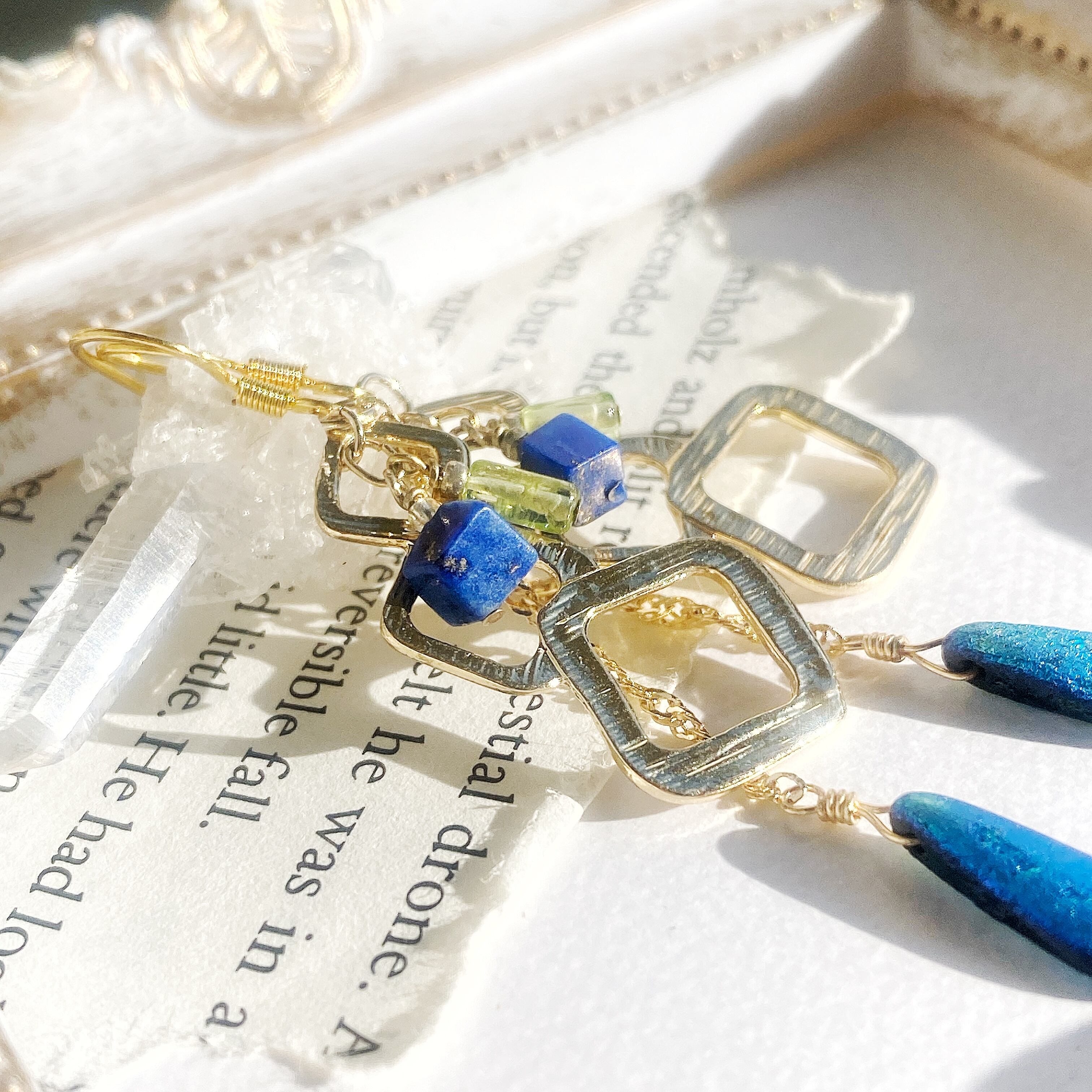 メインにはキューブカットのラピスラズリを、その他ペリドットを使用しています。