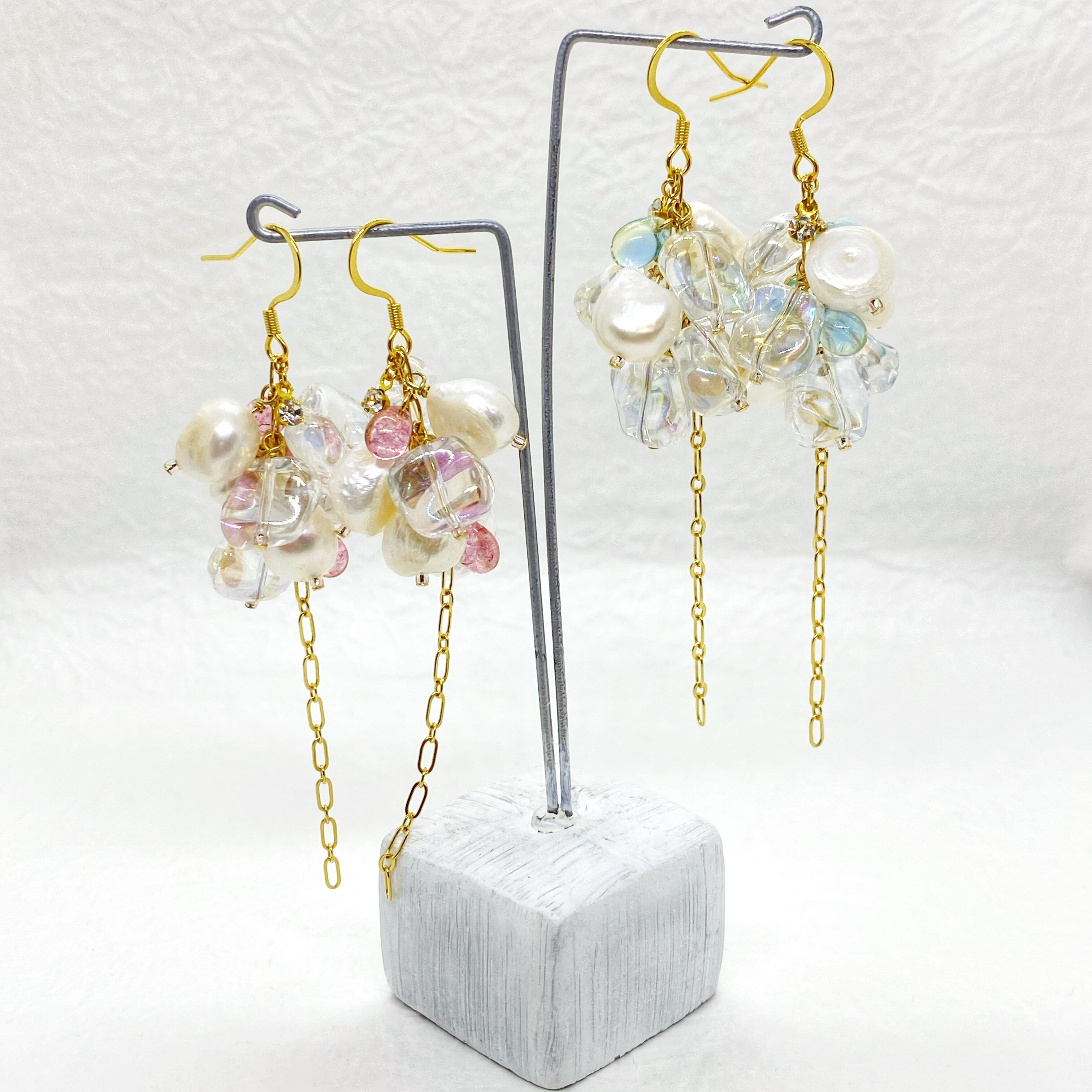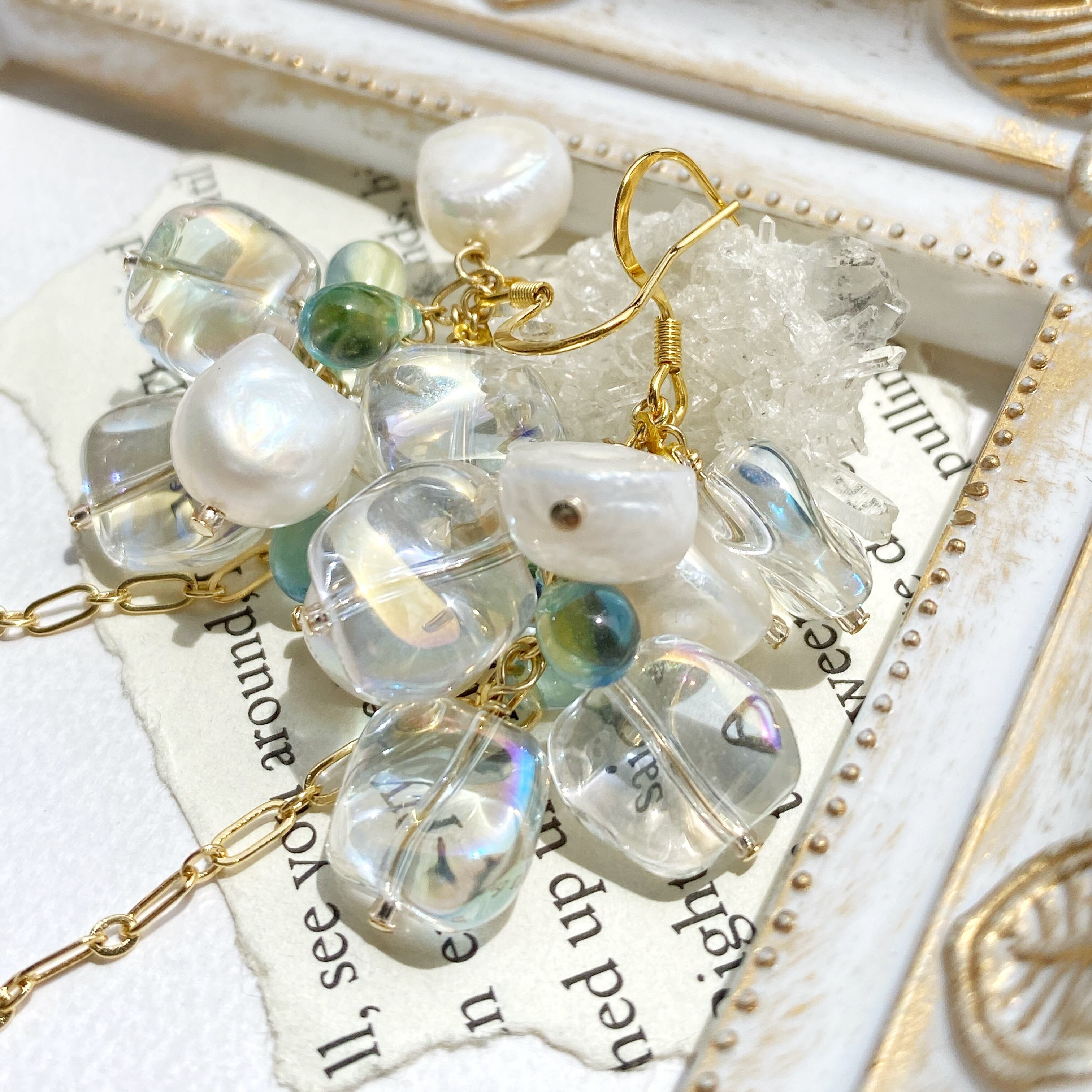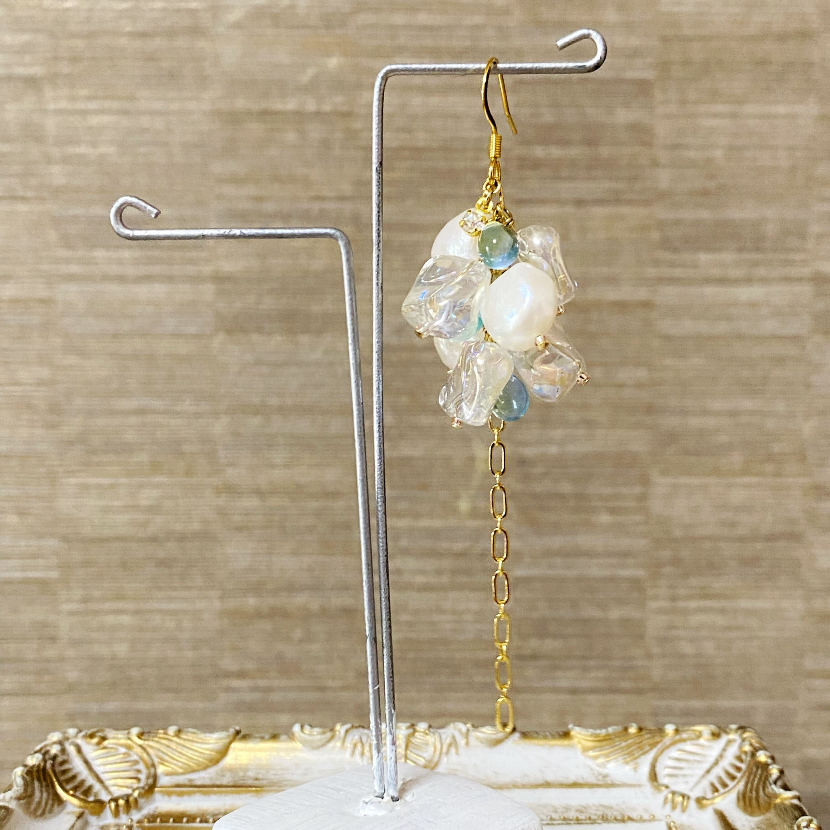 オーロラ調のクリアガラス、チェコビーズ、淡水パールを合わせたピアスです✧︎*。